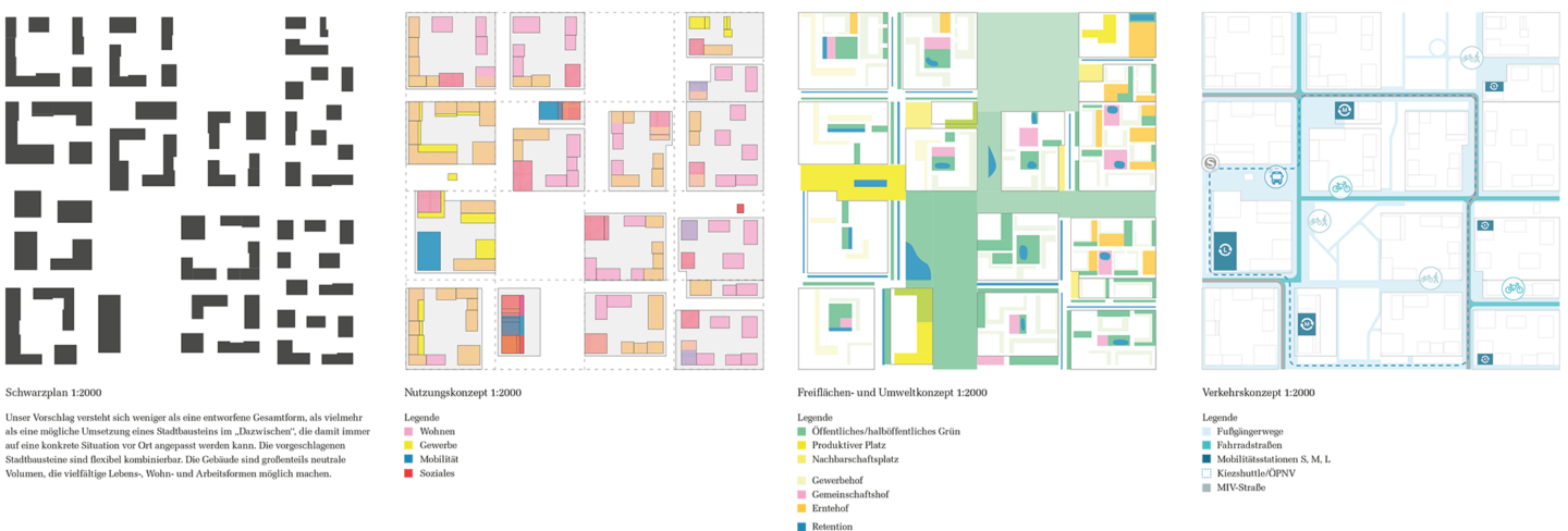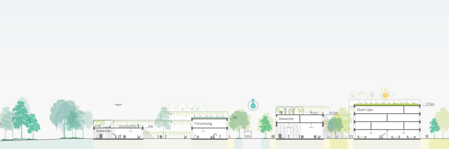 Der Entwurf entwickelt unter diesem Motto einen urbanen Stadtbaustein mit Vorbildfunktion in Sachen Klimawandel, Senkung des Ressourcenverbrauchs und der Emissionen für die hohe Lebensqualität von Bewohnerinnen und Bewohnern. Noch ist die Umgebung des Planungsgebietes durch sehr heterogene Nutzungs-, Bebauungs- und Freiraumstrukturen geprägt und stellt sich derzeit als städtebaulich ungeordneter Raum dar.