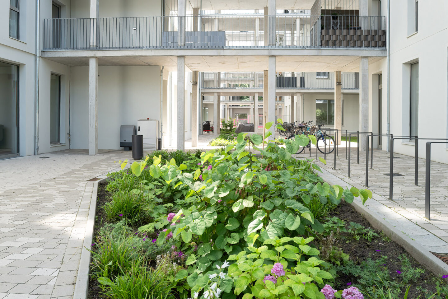 Darüber hinaus gibt es in den grünen Wohnhöfen oberflächennahe Verdunstungs- und Versickerungsflächen. Das Zusammenspiel aus den geöffneten Blockstrukturen mit grünen Innenhöfen, Gebäude mit grünen Dächern und klimaaktiven Fassaden, gemeinsam mit den blau-grünen Wohngassen sorgen für ein angenehmes Mikroklima im neuen Quartier.
