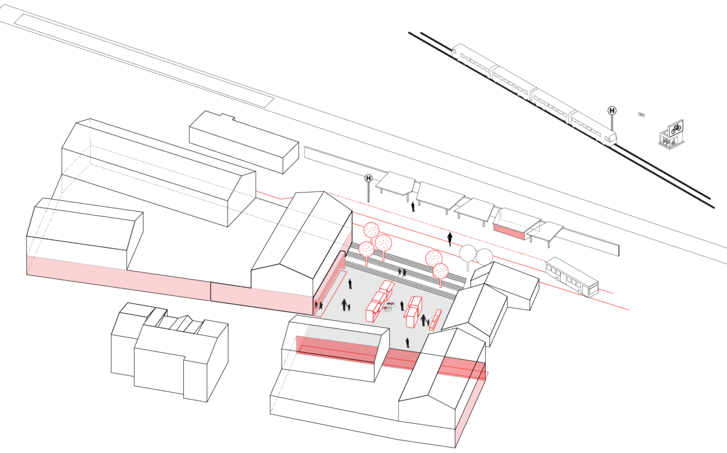 Während die im Gewerbeband an den Gleisen liegenden baumbestandenen Freiflächen überwiegend Stellplätze und kleinere Freizeit-/ Sportangebote aufnehmen, formulieren die Maibaumwiese und der neue Marktplatz das eigentliche Zentrum des Ortes. Der neue Platzraum spannt sich zwischen der Freitreppe vorm Busbahnhof über die verkehrsberuhigte Hauptstraße bis zum Drogeriemarkt. Der Platz, die Nutzungen im EG und der direkte Bezug zum Bushalt machen den Neuen Markt zum identitätsstiftenden Herzstück der Wesslinger Ortsmitte.