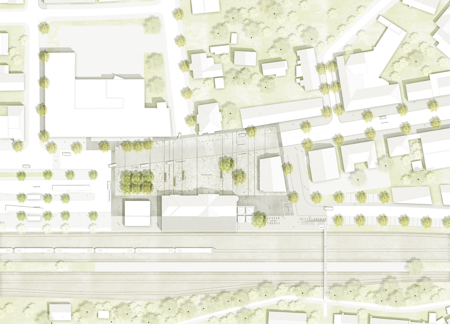 Im südlichen Teil dagegen formulieren zwei starke, überwiegend geschlossene Blöcke das bauliches Pendant zum ehemaligen Bahnhofsgebäude. Der neue Park am nördlichen Rand des Westufers besteht aus drei großzügigen Wiesenflächen, die weitestgehend frei gehalten werden. Nur die erhaltenswerten Bestandsbäume verbleiben auf den Wiesen.