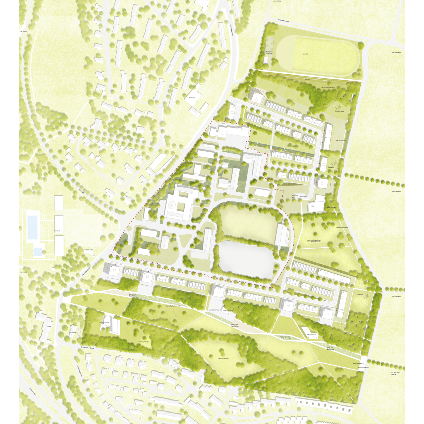 Die Entwurf nutzt die landschaftlichen und topographischen Gegebenheiten des Ortes hervorragend. Die Grünzüge der Parkstadt wie an der Parkstraße und der Parkstädter Straße werden bis in das ehemalige Kasernenareal hinein verlängert. Auf dem Areal selbst bieten die drei Terrassen, der ehemalige Exerzierplatz und die südlichen Unterstände (AeroHallen) mit ihrer dichten Baumfassung gute Anknüpfungspunkte, um das neue Quartier auch mit dem östlichen, landwirtschaftlichen Raum zu verweben.